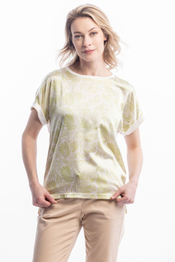 Изделие привлекательно тем, что сочетает в себе черты как блузки, так и футболки за счет трикотажной части. Модель свободно прилегает к телу, при этом не стягивает и оставляет свободу для движений.