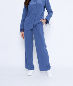 Брюки представлена в шикарном цвете Ensign Blue, который является эксклюзивным. По нашему заказу шелк окрашивался на фабрике, которая специализируется на работе с шелком. Ensign Blue — это благородный, сочный и манящий оттенок синего цвета, который сочетается со всеми цветами. Насыщенный глубокий оттенок синего по-настоящему завораживает и смотрится очень эффектно и элегантно.