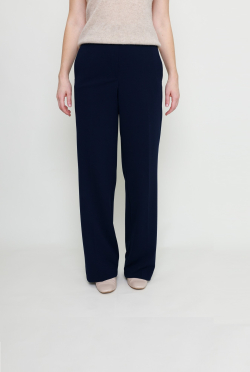 Брюки в универсальном синем цвете удачно сочетаются с черными жакетами, легкими трикотажными джемперами, блузками и топами. Изделие имеет силуэтное прилегание и прямой крой, эффектно подчеркивают фигуру, комплементарно выглядят с туниками и верхами в стиле оверсайз.