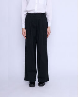 Широкие брюки из костюмной ткани с высоким содержанием шерсти. Модель имеет две мягкие складки у пояса. Темный цвет в сочетании с деликатной полоской прекрасно впишется в деловой стиль.