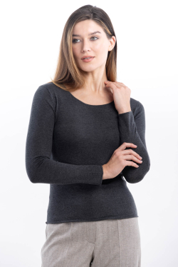 Джемпер Каоми в цвете мокрый асфальт выполнен с длинным рукавом – это самый базовый вариант длины, которая идеально подходит для прохладной погоды и позволяет создавать многослойные образы.