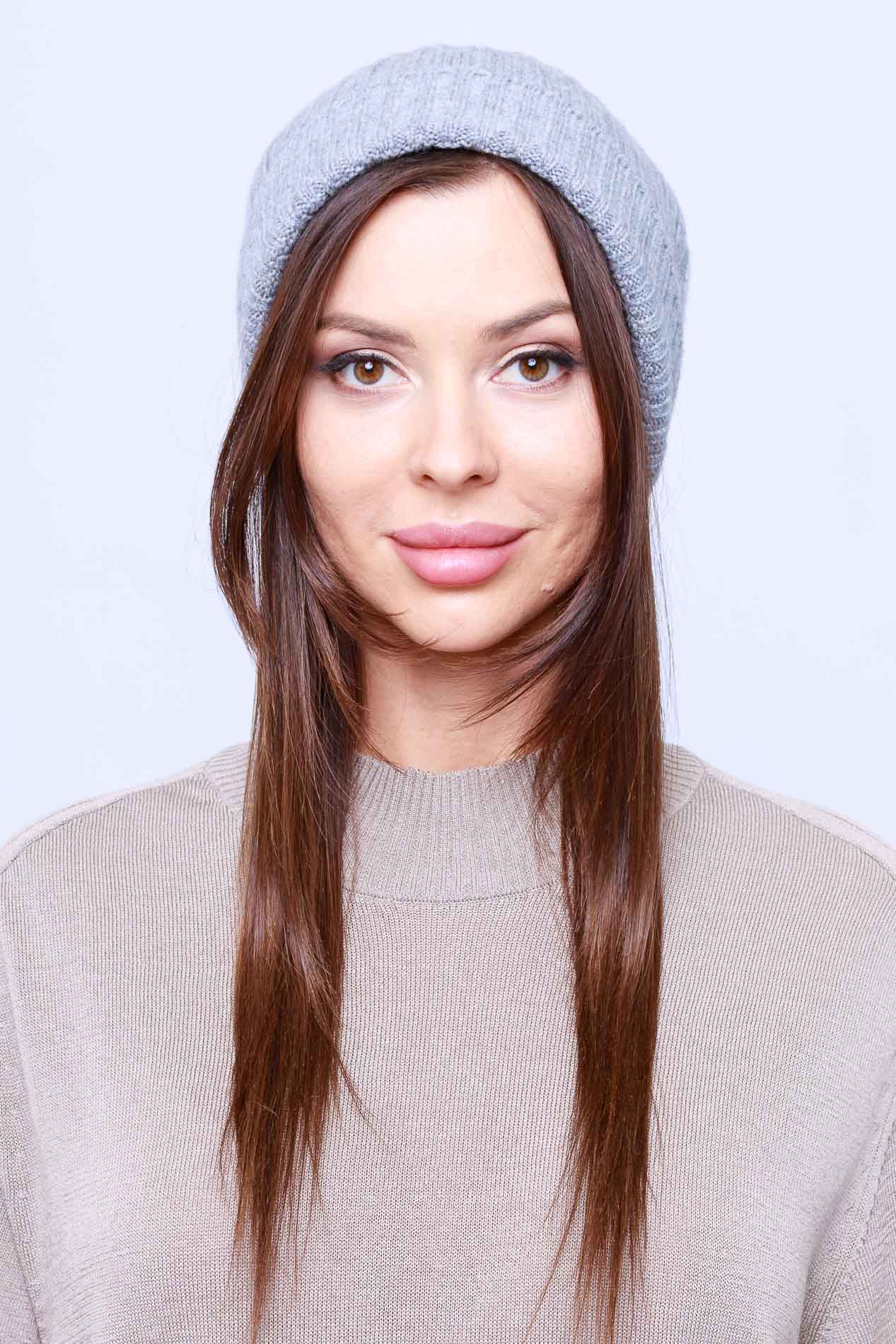 Однотонная шапка с отворотом выполнена вязкой "резинка".