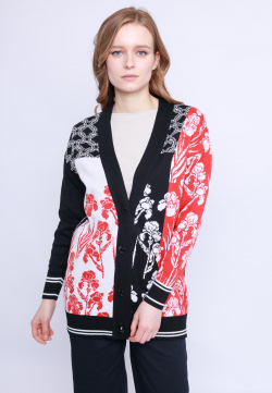 Кардиган выполнен в стиле колор-блок и дополнен жаккардовым рисунком в виде комбинации орнамента Khan. Cashmere и цветочным узором из элегантных ирисов, которые придают кардигану женственности. Техника вязания жаккардом позволяет получить полотно, которое великолепно держит форму, это более плотный вид вязки, при котором изделие выглядит презентабельно. Этот узор подходит абсолютно для любых поводов, выглядит элегантно, свежо и ненавязчиво. В зависимости от выбранного низа можно получить как деловой, так и романтичный образ.