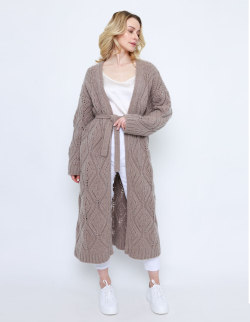 Кардиган дополнен трикотажным поясом, который позволит носить изделие зафиксировав его на запах. Такой вариант прекрасно подойдет для использования кардигана в качестве верхней одежды в прохладные дни. Цвет кофе с молоком отлично сочетается с базовыми цветами гардероба.
