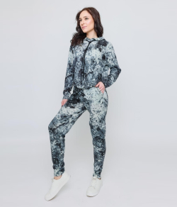 Костюм представлен из двух предметов – брюки джогеры и худи. Модель костюма предусматривает разные варианты посадки, можно сказать на любой вкус. Любительницам стиля оверсайз стоит выбирать модель на размер больше своего фактического, а тем, кто любит посадку «по-фигуре» можно примерить комплект размер в размер или на один размер меньше. Верхняя часть костюма представлен в виде худи с капюшоном на завязках. Худи имеет свободную посадку, укороченную длину и длинные рукава с манжетами в виде резинки, что позволяет изделию прекрасно держать форму. Эта модель сделает фигуру более хрупкой, а также позволит дополнительно поддевать майку или водолазку для тепла. Худи хорошо вписывается в стиль кэжуал или спорт-шик, удачно смотрится с юбками. Низ костюма представлен в виде брюк – джоггеров. Это удобные и стильные штаны, которые станут отличной альтернативой классическим брюкам и подойдут женщинам с любым типом фигуры. Брюки имеют среднюю посадку, фиксируются на талии при помощи вшитой резинки. По бокам с обеих сторон расположились функциональные карманы с листочкой, штанины имеют зауженный крой и фиксируются снизу манжетами в виде резинки. Костюм выполнен в трендовой расцветке, напоминающей выстиранные чернильные капельки синего цвета, данный принт разработан специально для Khan. cashmere, а значит является эксклюзивным и его можно найти только в наших бутиках. Цветовая палитра принта позволит с легкостью вписать его в ваш гардероб и дает возможность сочетать как верх, так и низ с вещами вашего гардероба.