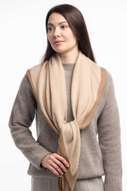 Большая косынка из верблюжьего пуха выполнена гладкой вязкой с контрастной окантовкой по всему краю.