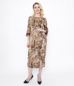 Рукав ¾ по линии манжет дополнен тонкой ниткой перьев, которые превращают платье в акцентную вещь гардероба. Для удобства и вариативности в применении мы продумали и реализовали съемные перья, их можно легко снять и закрепить обратно при помощи кнопок.