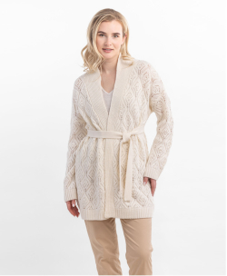 Модель средней длины прекрасно садится на любой рост и тип фигуры. Кардиган дополнен поясом.