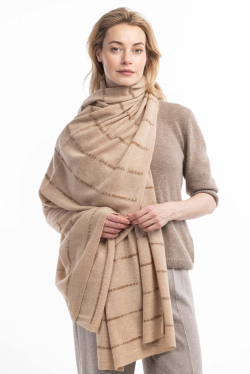 Палантин выполнен тонкой вязкой из верблюжьего пуха с узором из вплетенных полос пряжи другого цвета.