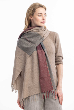 Тканый тонкий палантин из верблюжьего пуха. Изделие имеет классический и деликатный рисунок в виде квадратов разного цвета. По краю палантина бахрома длинной в 7 см.