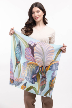 Платок из 100% шелка расписан вручную. На нежно бирюзовом полотне большие ирисы радужной расцветки.