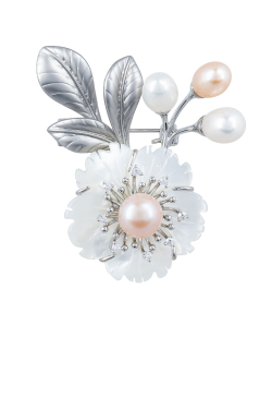 Серебристая веточка с жемчужинами и цветком из перламутра украсит любимый кардиган или палантин.