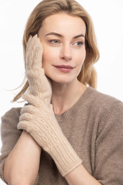Кашемировые перчатки украшены аккуратным узором из кос. Нежность материала подчеркнута натуральным светлым цветом пряжи. Перчатки мягко облегают кисти рук и не создают лишнего объема.