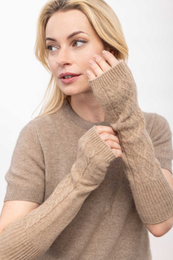 Удлиненные митенки выполнены из верблюжьей шерсти фактурной вязкой из ромбов и кос.
