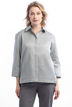 Благодаря потайной планке пуговицы блузки остаются незаметными, оставляя нетронутой безупречность прямых линий. Классический крой наделяет блузку определенной сдержанностью, которая будет уместна в офисных образах или на различных мероприятиях, где необходимо выглядеть стильно и профессионально.