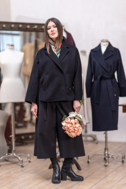 Пальто - жакет с классическим английским воротником и треугольными лацканами, которые выигрышно подчеркивают силуэт. При разработке данной модели особое внимание уделили крою и воротнику благодаря чему он имеет идеальную форму и очень красиво ложится.