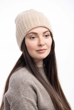Мягкая и теплая шапка из натурального неокрашенного кашемира. Оригинальная вязка - полосы и косы.