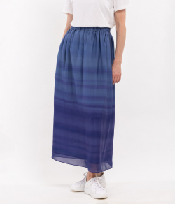 Ткань для юбки была окрашена в авторский дизайн принта по нашему индивидуальному заказу. Принт в виде плавного градиента в синих оттенках это самая главная изюминка данной модели. Этот визуальный эффект, словно запечатленный момент перехода от глубокой ночной синевы к лазурному утреннему небу, притягивает взгляд и создает ощущение легкости и динамики. Градиент, выполненный с безупречной точностью и плавностью, придает изделию неповторимый шарм и делает его узнаваемым среди множества других.