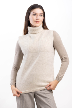 Жилет выполнен с невероятно удобным высоким воротником стойкой, который идеально защищает от холодного ветра, так как он связан из мягкой, но плотной шерсти, придающей необыкновенное ощущение тепла и уюта. Воротник объемный, но в тоже время не плотно прилегает к шее, не создавая дискомфорта во время носки. Благодаря тонкой пряже воротник красиво драпируется, при этом он не создает лишнего объема и не мешает под верхней одеждой.