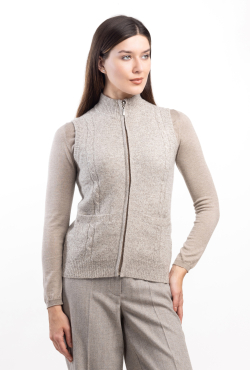 При этом жилет не потерял женственности - полочка жилета украшена неброским, но выразительным узором в виде вертикальных кос. Этот деликатный рисунок придает изделию текстуру и глубину, визуально вытягивая силуэт и добавляя образу утонченности. Вертикальные линии кос создают ощущение движения и легкости, подчеркивая природную грацию женщины.