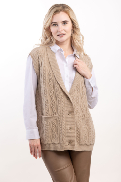 Жилет связан в натуральном бежевом оттенке, такие изделия самые ценные и эксклюзивные, так как имеют первозданный оттенок, созданный самой природой. Такие цвета идеально сочетаются с другими цветами и их легко вписывать в гардероб. Жилет с одной стороны имеет классические формы, с другой стороны наделен актуальными чертами. Эти характеристики позволят данному изделию всегда быть актуальным вне зависимости от времени и трендов.