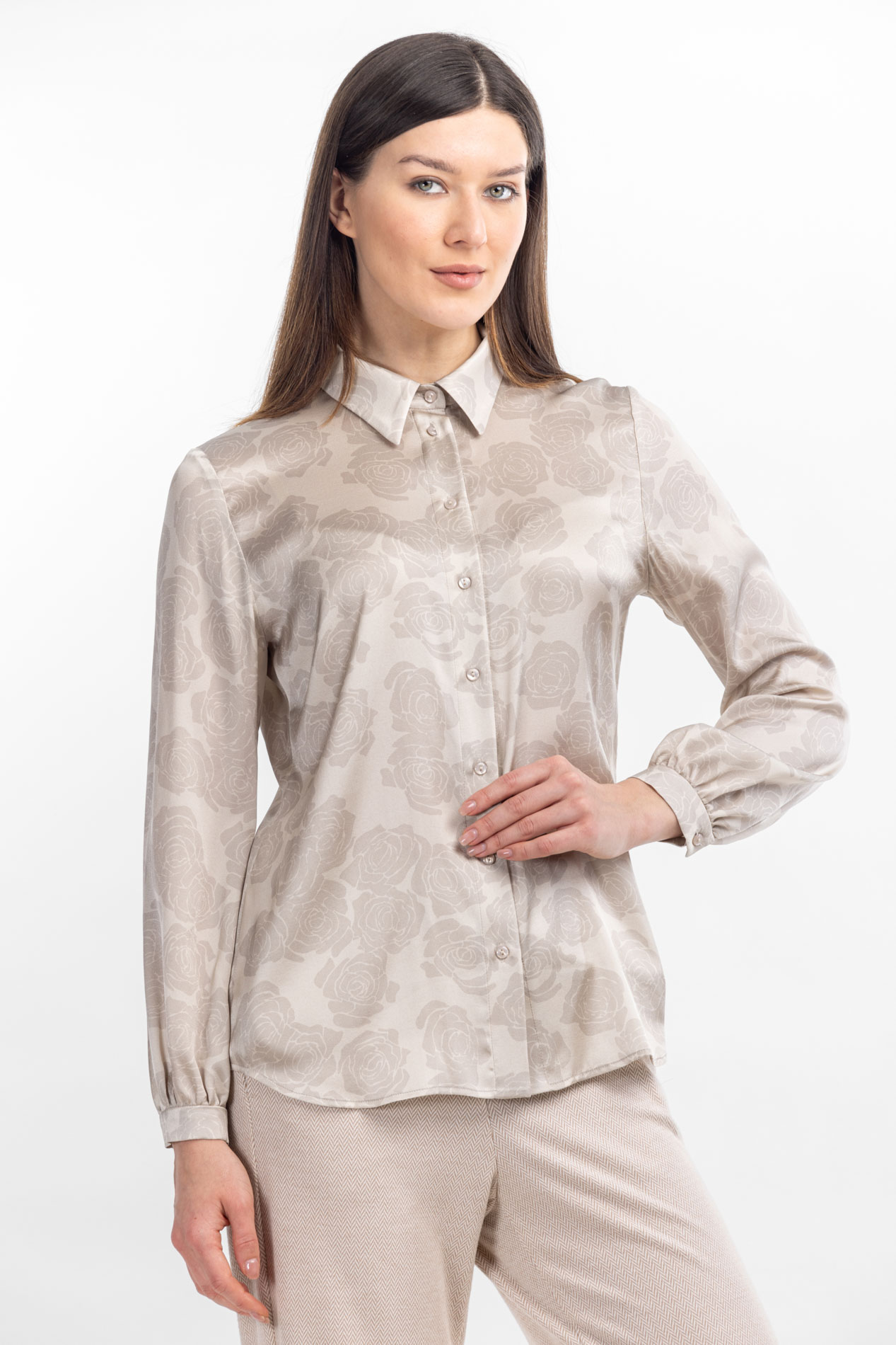 Изделие выполнено в волшебном нежном бежевом оттенке, который в сочетании с переливающейся структурой шелка создает идеальную подсветку портретной зоны. От этого цвета лицо сияет, как от хайлайтера, выглядит свежим и ярким. Деликатный дизайнерский принт в виде графичных роз в оттенке на несколько тонов темнее основного цвета невероятно комплементарно играет на шелковом твиле. Этот наряд словно создан для того, чтобы ловить восхищенные взгляды и чувствовать себя уверенно в любой ситуации. Шелковый твил, из которого сшито изделие, обладает не просто благородным блеском, а глубинной игрой света. Каждое движение рождает новые отблески, мягко подсвечивая овал лица и зону декольте, что визуально выравнивает тон кожи и придает образу флер безупречности. Ткань, плотная и в то же время невесомая, идеально держит форму, создавая элегантный силуэт.