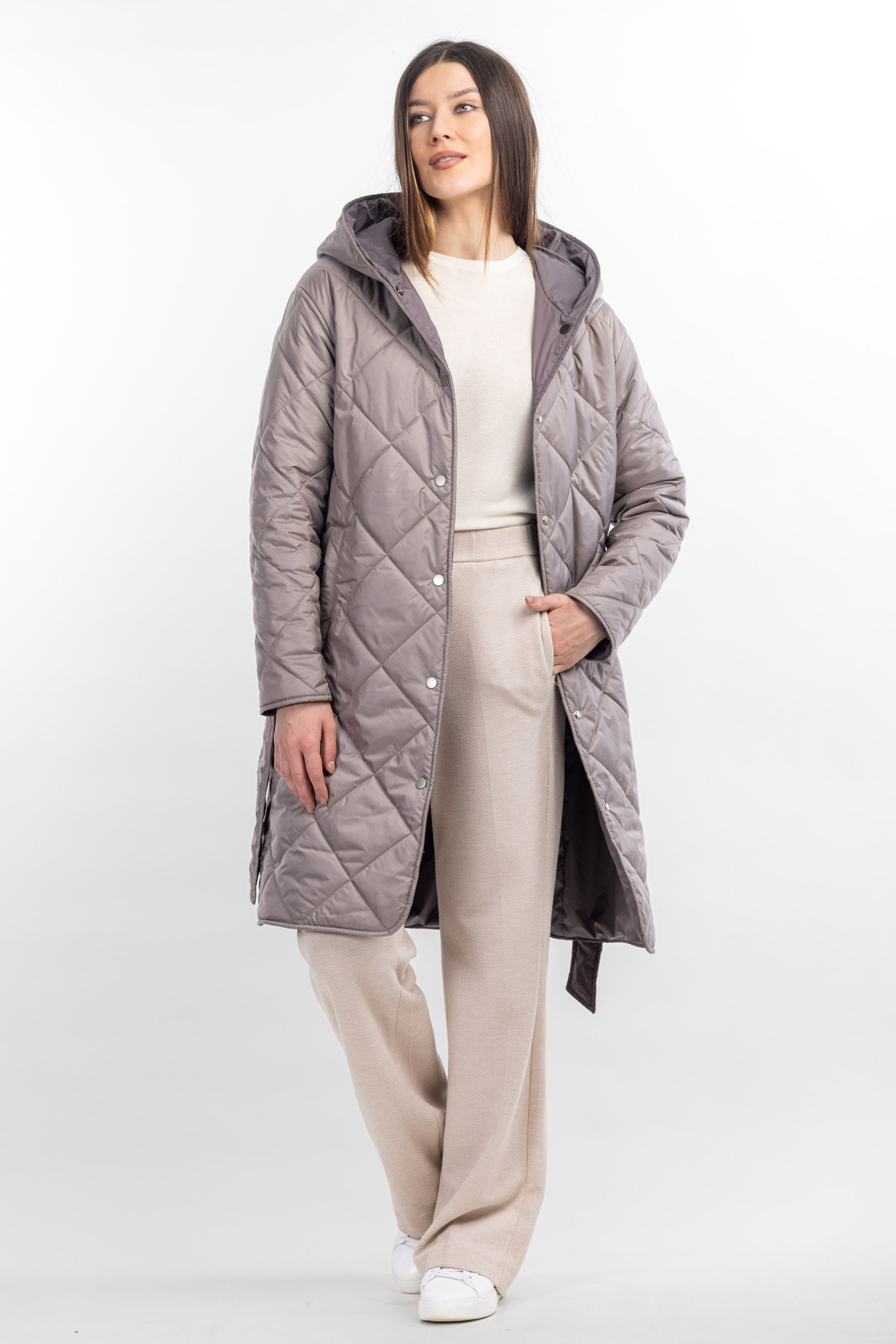 Двустороннее пальто удачно сочетает в себе свободный повседневный стиль с элементами классики. Одна часть изделия декорирована стильной ромбовидной стежкой, что позволяет гармонично вписать его в городской стиль и составить интересные кэжуальные образы, а также удачно комбинировать со спортивной одеждой. Данный дизайн выглядят современно и практично. Обратная сторона имеет более формальный, классический стиль, который прекрасно гармонирует с офисными и деловыми вариантами и подходит для тех, кто предпочитает сдержанность в образах. Два боковых кармана украшены листочкой и выполнены без застежек.